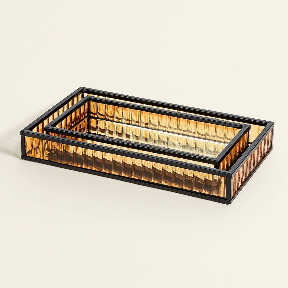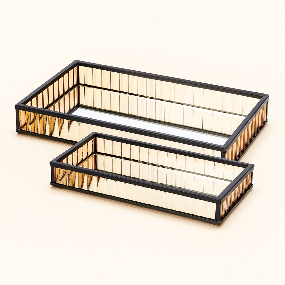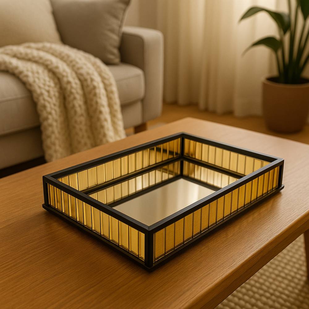 Victoria es mucho más que una bandeja: es un escenario para tus mejores piezas. Con su amplia superficie, su base de espejo captura y refleja la luz, haciendo brillar cualquier elemento que repose sobre ella. El marco negro en contraste y el cristal biselado en dorado aportan un aire distinguido, con ese toque de lujo sutil que nunca pasa de moda.