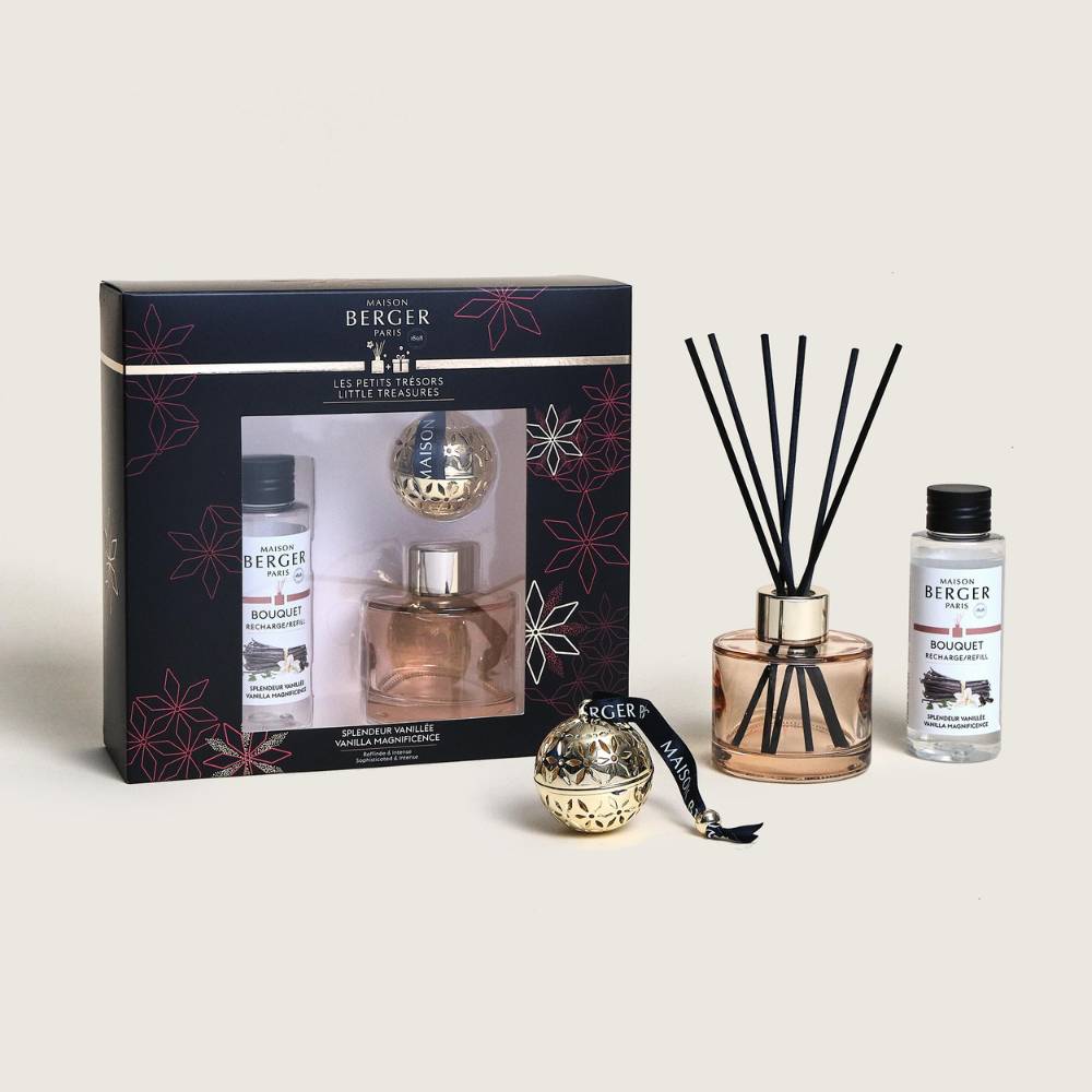 Descubre el cofre Pomelis Pequeños Tesoros, la joya de Maison Berger. Un elegante set que une tradición e innovación: mini bouquet Nude con recarga Splendeur Vanillée (90 ml) y un exclusivo pomander cerámico inspirado en los amuletos medievales.