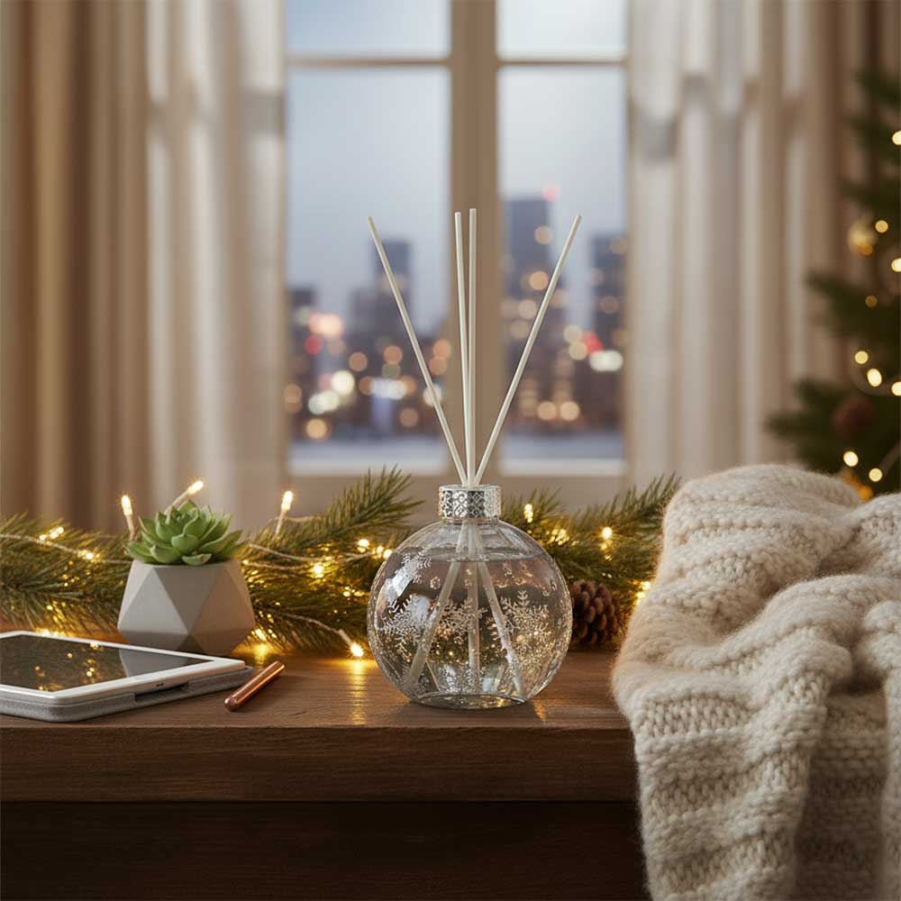 El Envase Mikado Navidad Copo de Nieve Transparente es una joya decorativa inspirada en las bolas del árbol de Navidad. Su cristal claro con relieve de copos de nieve refleja la luz y deja ver el color de tu fragancia, aportando un toque delicado y festivo a cualquier rincón.