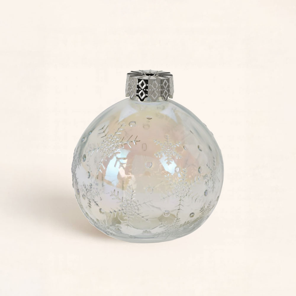 Combina elegancia y delicadeza. Su diseño redondeado, inspirado en una bola navideña, está decorado con relieves de copos de nieve que reflejan la luz y dejan ver el tono de tu esencia favorita.