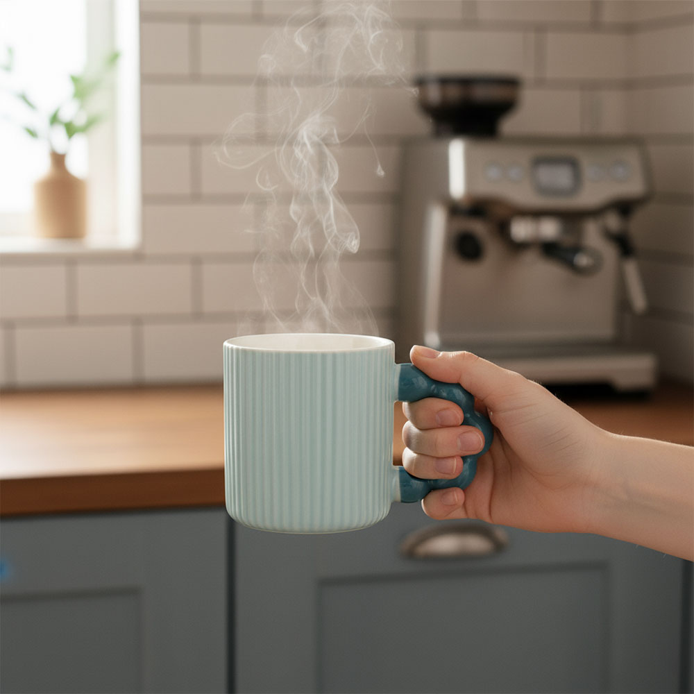 Su acabado acanalado en azul suave transmite serenidad, mientras que el asa burbujeante, de un azul más intenso, añade contraste y personalidad.