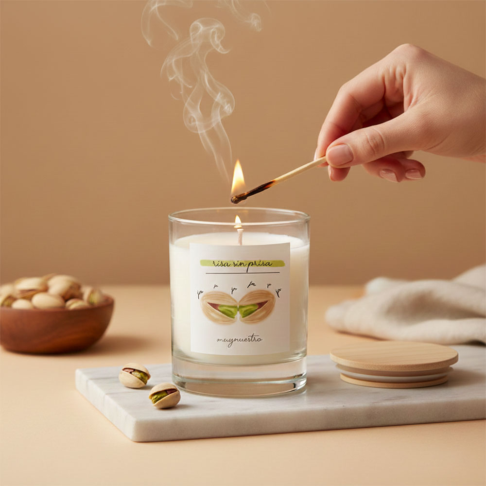 Enciende la vela unos minutos antes de sentarte a disfrutar del momento. El aroma a pistacho empezará a envolver la estancia justo cuando tú bajas el ritmo. Si la combinas con la bruma Risa sin Prisa, crearás una experiencia olfativa de scent layering completa y muy LoeS.