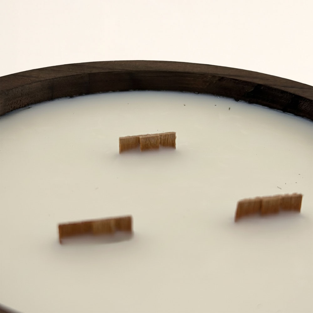 Tiene tres mechas de madera crepitante y un aroma profundo a sándalo, rosa de damasco y especias.